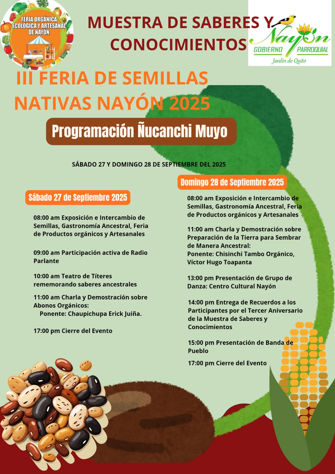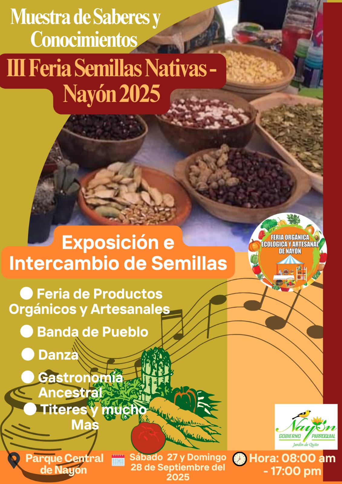 El próximo sábado 27 y domingo 28 de septiembre se llevará a cabo la III Feria de Semillas Nativas Nayón 2025, un evento que busca preservar la biodiversidad y fortalecer las tradiciones comunitarias en el Parque Central de Nayón, desde las 08h00 hasta las 17h00.
