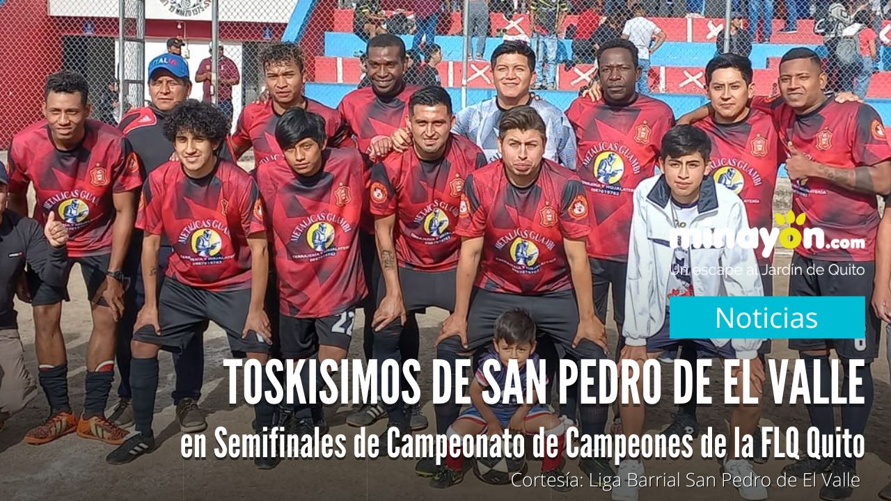 La joven institución deportiva Toskisimos, representante de San Pedro de El Valle (Nayón), disputará el partido de vuelta de la semifinal del Campeonato de Campeones de la Federación de Ligas Barriales de Quito FLQ, frente al club Avellaneda de San José de Monjas. Este partido se efectuará el próximo sábado 20 de agosto a las 14h00 en el Estadio de San Pedro de El Valle.